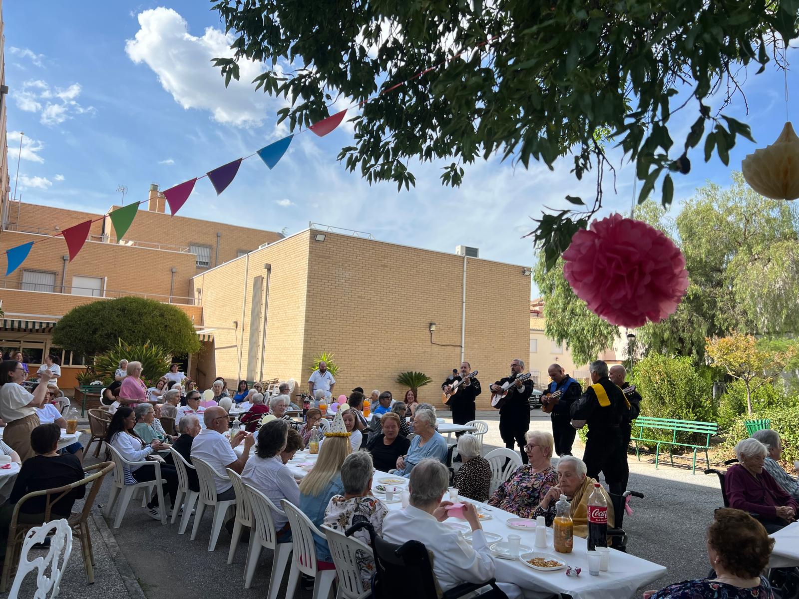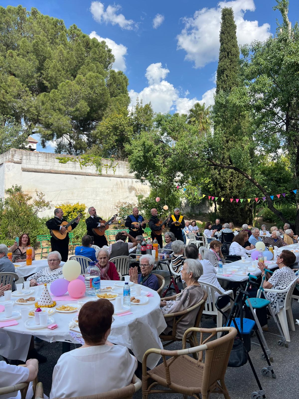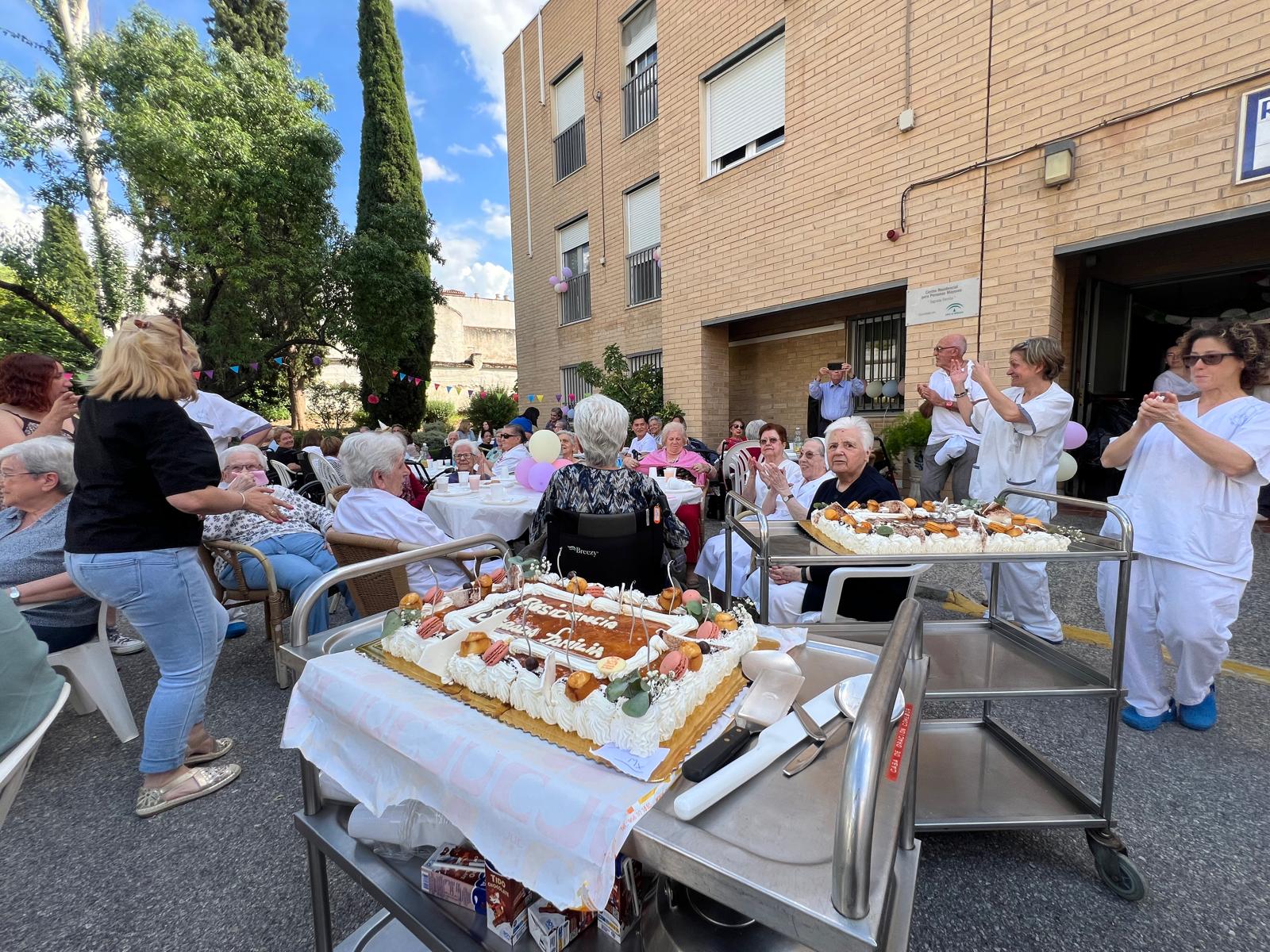 Para conmemorar esta fecha tan especial, pusimos todo nuestro cariño en preparar cada detalle: la merienda, un obsequio para los asistentes… y no podía faltar, la tarta. Además, la decoración con guirnaldas, globos… creó un ambiente festivo y colorido en el jardín de entrada a la Residencia.
