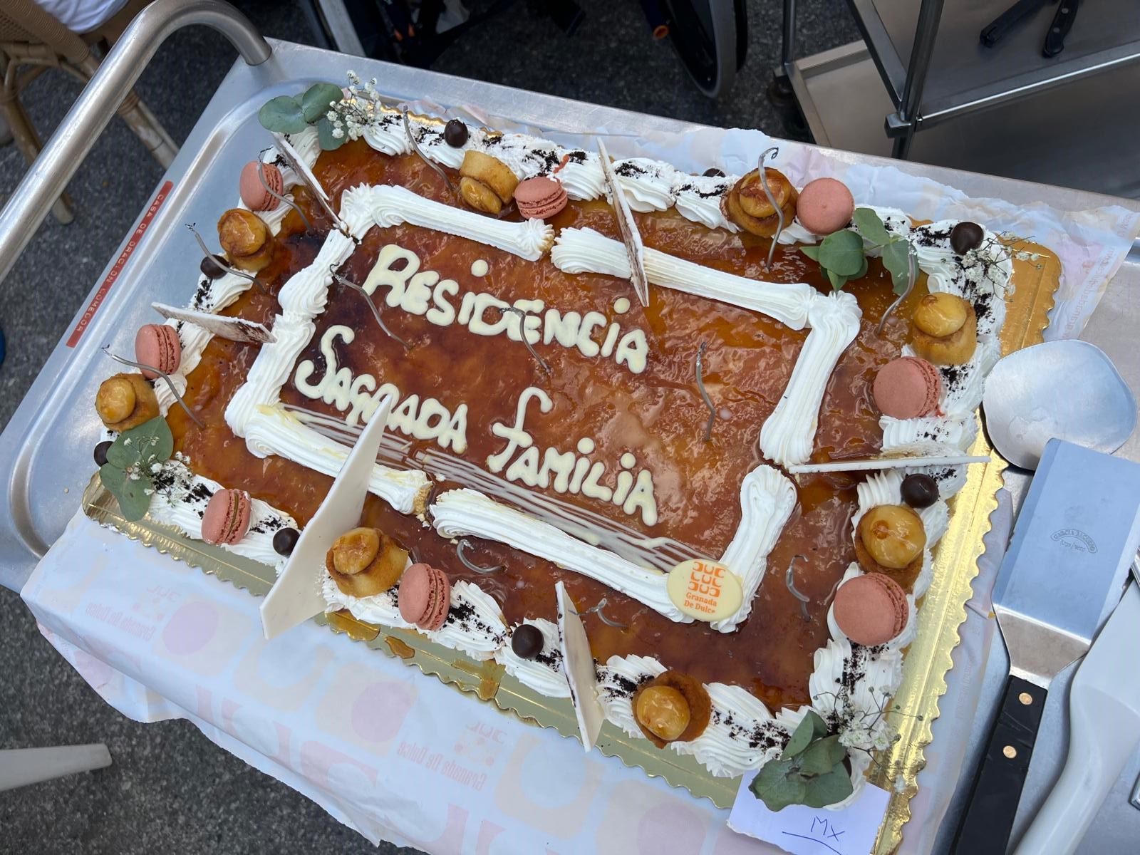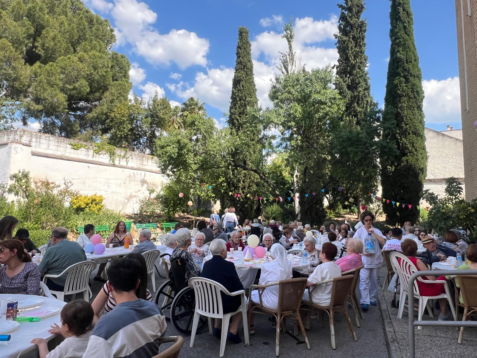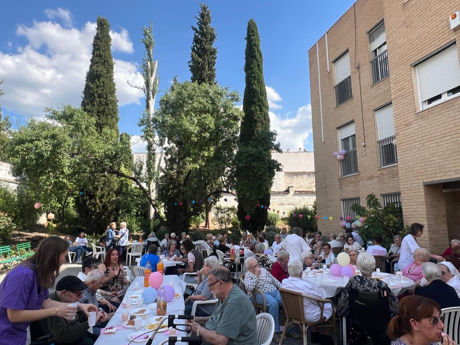 Para conmemorar esta fecha tan especial, pusimos todo nuestro cariño en preparar cada detalle: la merienda, un obsequio para los asistentes… y no podía faltar, la tarta. Además, la decoración con guirnaldas, globos… creó un ambiente festivo y colorido en el jardín de entrada a la Residencia.
